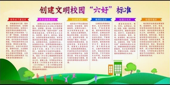 做好教學設施規劃管理使用,校園教學、文藝、體育、科技等活動場所布局合理、整潔有序。做好校園凈化綠化美化工作,自然景觀、人文景觀錯落有致,使用功能、審美功能和教育功能和諧統一,建設美麗校園。加強安全教育,強化校園治安綜合治理工作,確保校園安全、穩定。整治校園周邊環境,維護校園周邊良好秩序。深入開展環保教育和節約教育,引導師生樹立保護環境和節約資源意識,培育節約資源的良好風尚。
