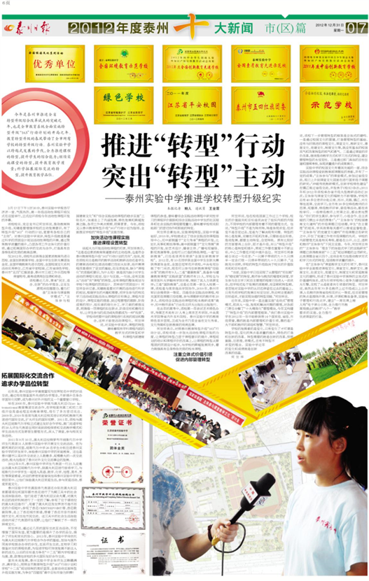 《泰州日報》市區十大新聞評選整版報道我校轉型升級、創新教育成就