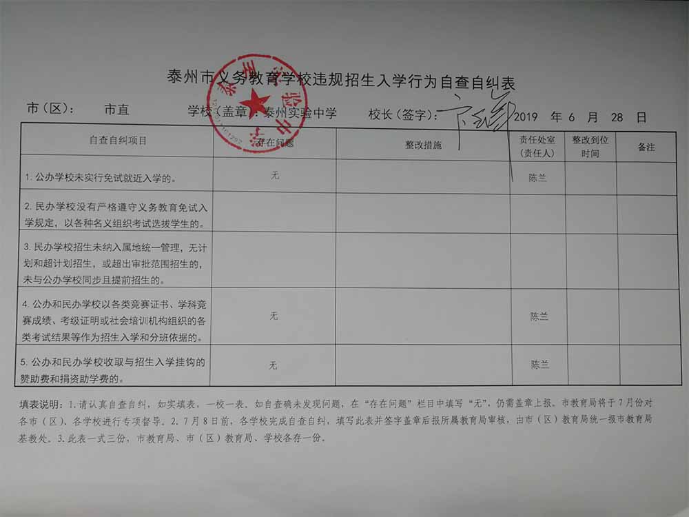 泰州市義務教育學校違規招生入學行為自查自糾表(泰州實驗中學)