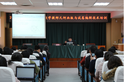 錢德春主任以正方形、圓、二次函數等常見圖形為例展示具體操作方法,整個培訓直觀明了,高效實用。所有與會數學老師認真聆聽,學會了如何使用幾何畫板,如何將幾何畫板中的圖形編輯到word文本里,如何在Excel中制作表格并將表格編輯到word里,如何在公式編輯器中調整代數式字體的大小,如何使用域標注弧的記號……