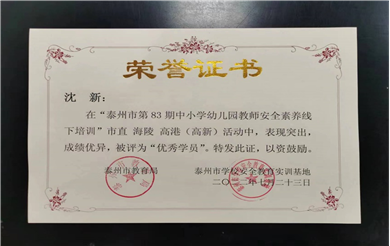 ????7月20日至7月23日,我校部分教師參加泰州市第八十三期中小學幼兒園教師安全素養培訓。其中沈新老師被評為優秀學員。