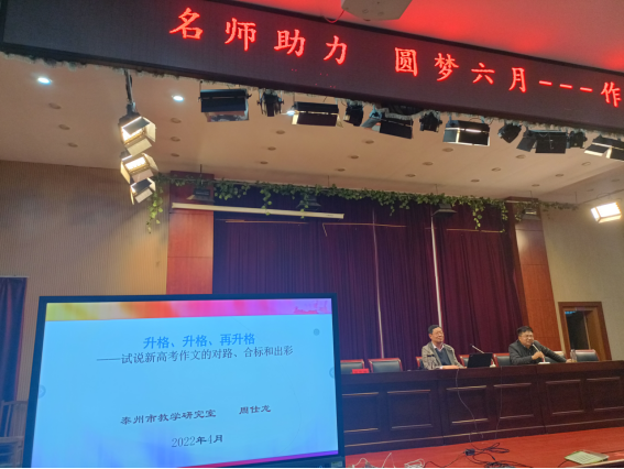 為了進一步提升語文教師的寫作教學水平和高三學生的寫作水平,4月28日下午,我校邀請了泰州市教育局教學研究室副主任周仕龍教授為全體高三學生和全校語文教師開設了“名師助力 ?圓夢六月——作文升格指導”講座。講座結束后,全校語文老師以論壇的形式和周主任進行了互動,周主任就作文升格教學中常見的問題和老師們展開了討論,并做了總結和指導。老師們受益匪淺,深覺講座和論壇對高三最后沖刺階段的作文教學起到了明確方向、鼓足士氣、提升水平的重要作用。