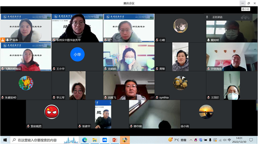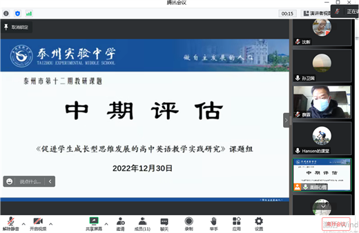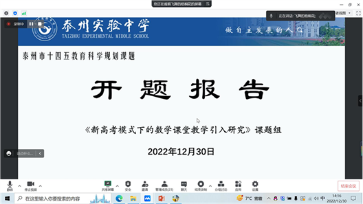 ????2022年12月30日下午兩點鐘,在經過緊張的籌備工作后,泰州實驗中學線上課題研究推進會隆重召開。本次課題推進會,是我校有史以來邀請專家最多、參與推進的課題數量最多的一次會議。我校共邀請到11位專家參與14項課題的論證。我們邀請到的專家有泰州市教科所副所長胡唐明,語文專家張本良、潘雙林,數學專家陸正海、戴如明,英語專家高莉,化學專家宗漢、生物專家黃敏,地理專家薛霖、歷史專家盧春建、綜合實踐活動專家沙國禪。課題論證類別分別為結題鑒定6項、中期論證3項及開題論證5項。為了使本次活動能夠高效進行,我們的課題推進會分成四個小組,每個小組3-4個論證的課題。