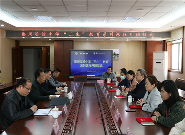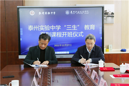11月27日中午,泰州實驗中學聯合泰州職業技術學院舉行“三生教育”課程實施開班儀式。泰州職業技術學院醫學技術學院院長周濤,教科研辦公室主任張星,學工辦主任張麗,成教辦公室副主任陳涓,護理系主任丁美紅,泰州實驗中學黨委書記、校長卞玉年,副校長楊建忠、劉永華,安管處主任王洪華、年級主任黃忠玉及“三生教育”課程授課老師代表參加了開班儀式。儀式由劉永華主持。